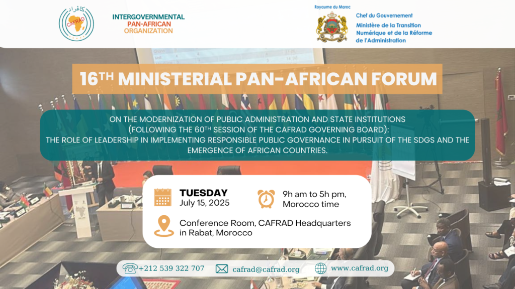 الرباط، 15 يوليوز 2025 – في منعطف حاسم لمستقبل القارة الإفريقية، يُنظم المركز الإفريقي للتدريب والبحث الإداري من أجل الإنماء (كافراد)، بالشراكة مع حكومة المملكة المغربية، الدورة السادسة عشرة من المنتدى الوزاري الإفريقي حول تحديث الإدارة العمومية ومؤسسات الدولة في الرباط. سيُعقد هذا الحدث رفيع المستوى في مقر كافراد في 15 يوليوز 2025، وسيضم صناع القرار العام الأفارقة الرئيسيين حول موضوع بالغ الأهمية، ألا وهو: دور القيادة في تطبيق حكامة عمومية مسؤولة لتحقيق أهداف التنمية المستدامة ونهضة الدول الإفريقية.