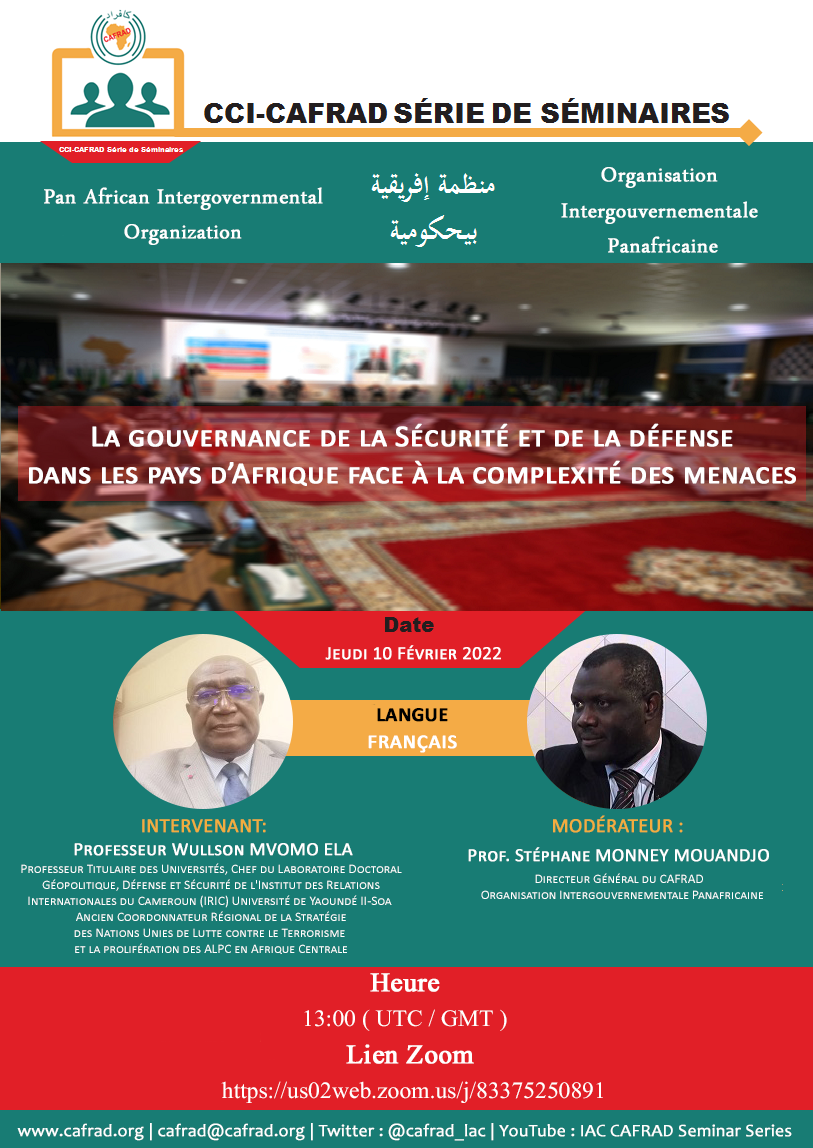 Le CAFRAD est heureux de vous annoncer la prochaine session de la série des séminaires CCI-CAFRAD, prévue jeudi 10 février à 13h00 (GMT), sous le thème de « La Gouvernance de la Sécurité et de la Défense dans les Pays d’Afrique Face à la Complexité des Menaces».