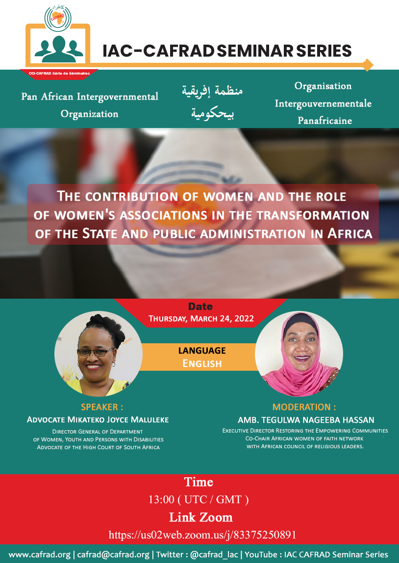 Le CAFRAD est heureux de vous annoncer la prochaine session de la série des séminaires CCI-CAFRAD, prévue jeudi 24 mars à 13h00 (GMT), sous le thème de «La Contribution des Femmes et le Rôle des Associations Féminines dans la Transformation de l’Etat et de l’Administration Publique en Afrique».