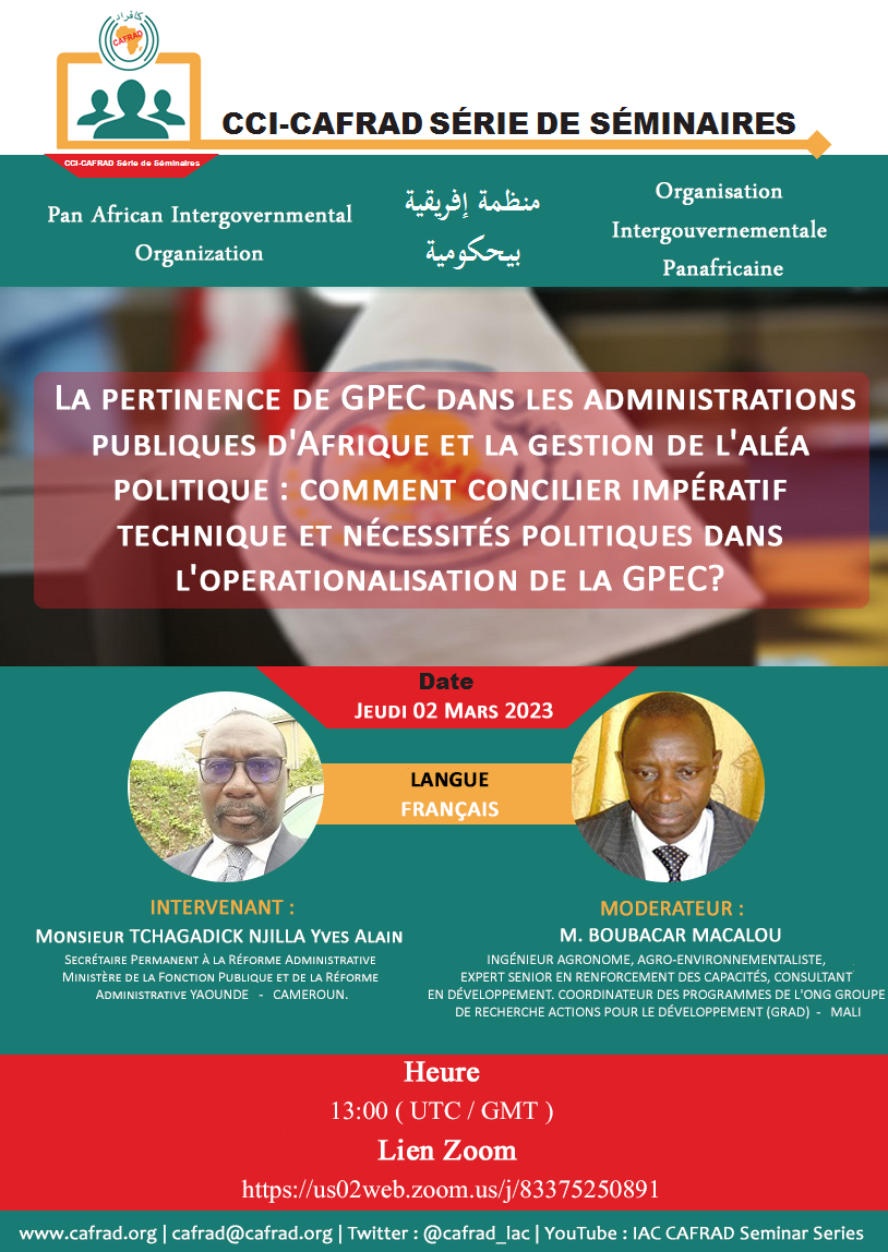 Le CAFRAD est heureux de vous inviter à participer à son prochain wébinaire, autour du thème : «La pertinence de GPEC dans les administrations publiques d’Afrique et la gestion de l’aléa politique : comment concilier impératif technique et nécessités politiques dans l’opérationnalisation de la GPEC? ».