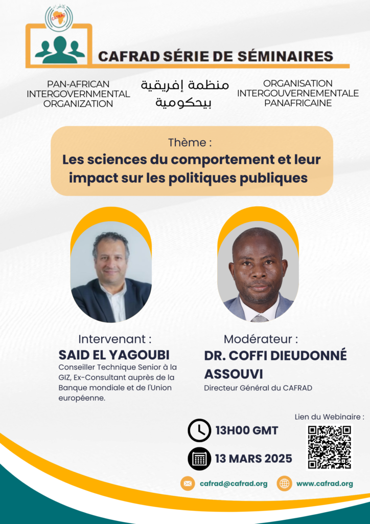 Cette rencontre importante aura pour thème « Les sciences du comportement et leur impact sur les politiques publiques ». Le CAFRAD aura l’honneur d’accueillir pour discuter de cette thématique Said El Yagoubi, Conseiller Technique Senior à la GIZ, Consultant auprès de la banque mondiale et de l’Union Européenne. La modération sera assurée par le Directeur général du CAFRAD, Dr. Coffi Dieudonné ASSOUVI.