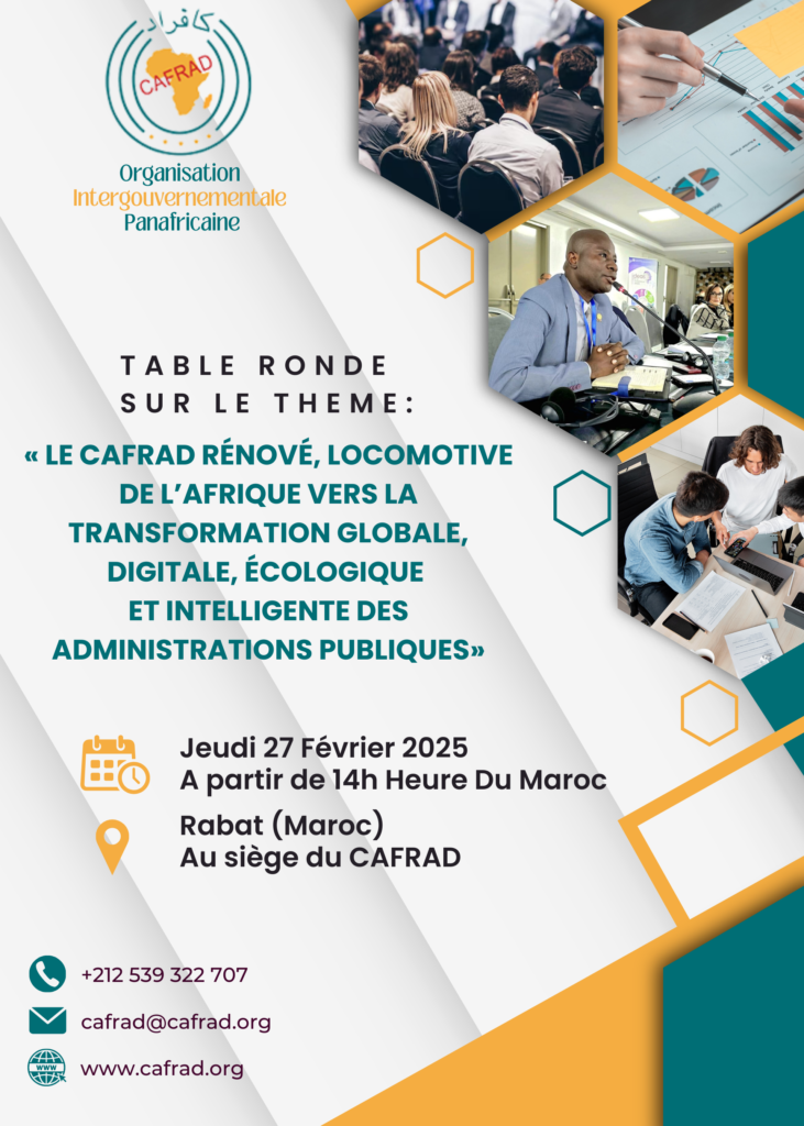 Le CAFRAD, sous le leadership de son nouveau Directeur général, lance son premier événement en plénière à Rabat : la Table Ronde des Partenaires Techniques et Financiers du CAFRAD sous le thème « Le CAFRAD rénové, locomotive de l’Afrique vers la transformation globale, digitale, écologique et intelligente des Administrations publiques », à Rabat, le 27 février prochain, au siège du CAFRAD.
