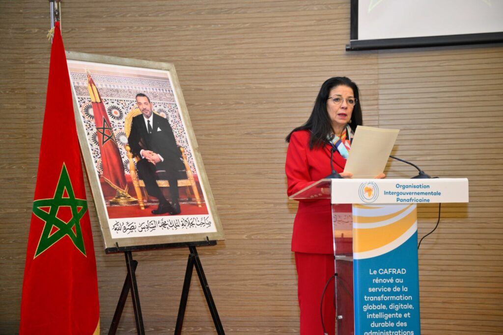 Les travaux ont été ouverts par S.E. Prof. Amal EL FELLAH SEGHROUCHNI, Ministre déléguée auprès du Chef du Gouvernement, chargée de la Transition numérique et de la Réforme de l’Administration, Présidente du Conseil d’Administration du CAFRAD. Dans son allocution, elle a souligné le caractère stratégique de ce colloque et l’importance du thème choisi, rappelant que la coopération sud-sud constitue un pilier majeur de la politique extérieure du Royaume, conformément à la Vision Royale. Elle a mis en avant les efforts du Maroc pour renforcer les partenariats africains, moderniser l’administration publique et promouvoir la transformation digitale au service des citoyens. Elle a également rappelé l’intérêt croissant porté à l’économie numérique, conformément au Message Royal de juillet 2022, et la vocation du Maroc à devenir un hub arabo-africain de transformation numérique en lien avec les Objectifs de Développement Durable 2030. Mme la Ministre a clôturé son intervention en remerciant le Directeur général du CAFRAD, le personnel et l’ensemble des participants.