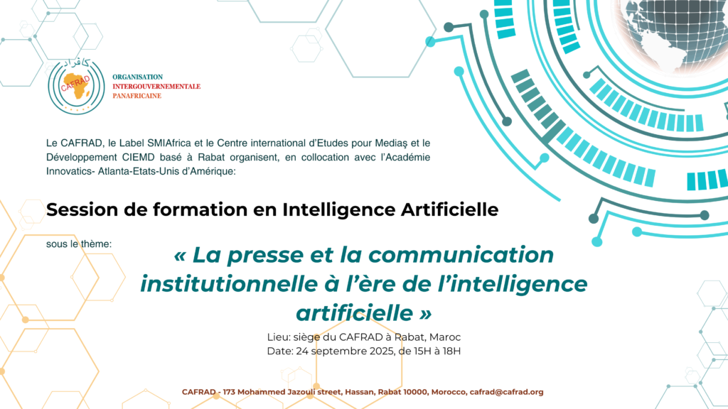 Le Centre africain de Formation et de Recherche administratives pour le Développement (CAFRAD), en partenariat avec le Label SMIAfrica, le Centre international d’Études pour Mediaş et le Développement (CIEMD), et l’Académie Innovatics d’Atlanta (États-Unis d’Amérique), a le plaisir d’annoncer l’organisation d’une session de formation portant sur le thème : « La presse et la communication institutionnelle à l’ère de l’intelligence artificielle ». Cette session de formation se tiendra en présentiel exclusivement, le mercredi 24 septembre 2025, de 15 heures à 18 heures, au siège du CAFRAD à Rabat. Elle sera dispensée en arabe et en anglais.