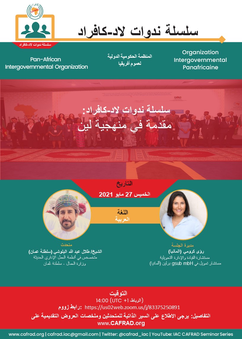 Dans le cadre de la Série de Séminaires CCI-CAFRAD, retrouvez-nous cette semaine pour une discussion le 27 Mai (Jeudi) à 14H00 (GMT+1), avec M. Talal Abdullah AlBalushi, spécialiste dans les sytèmes de travail administratif moderne au Ministère du travail, Oman, et modérée par Mme Rowaa Karomi, consultante en management et transformation, consultante en financement.